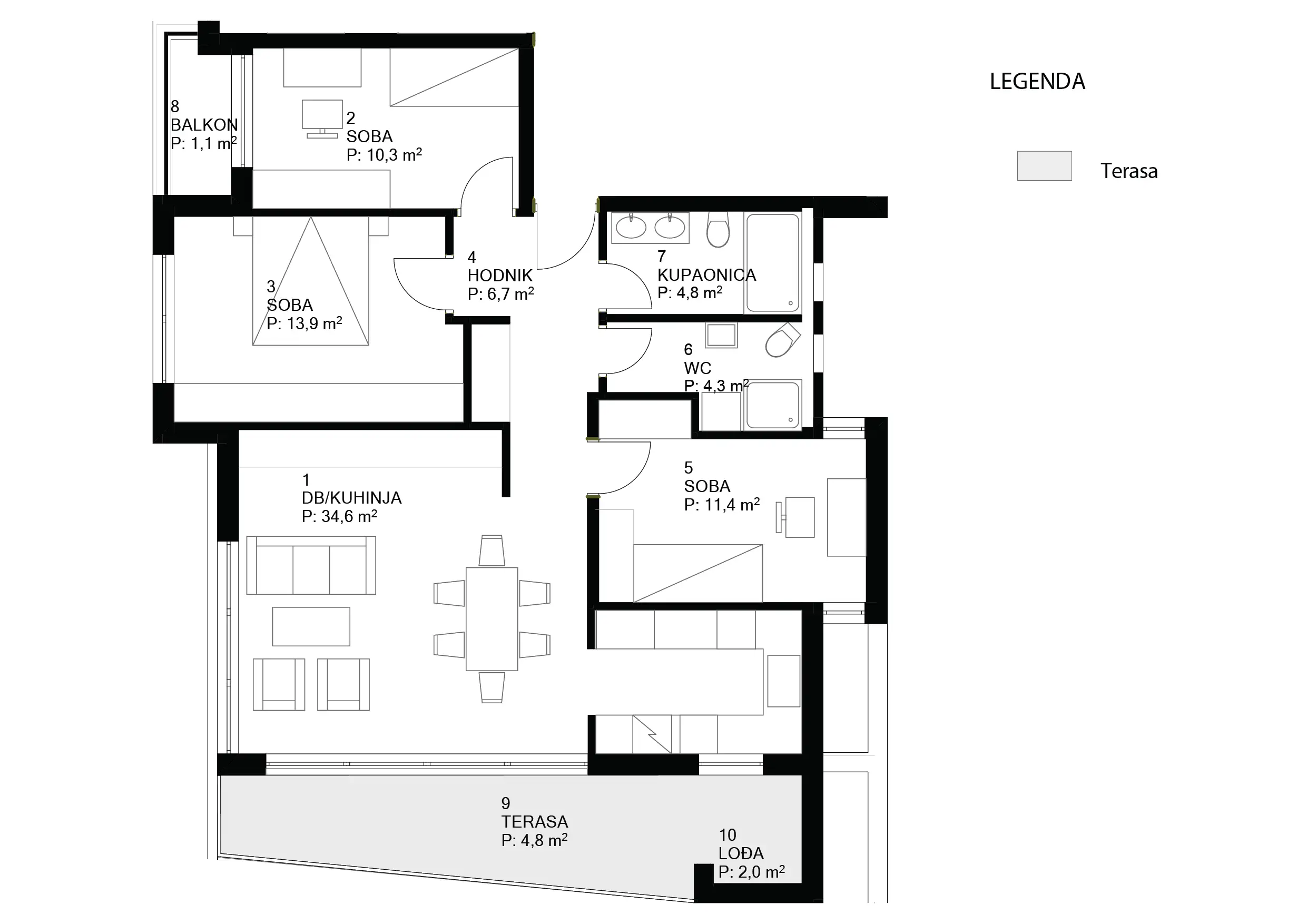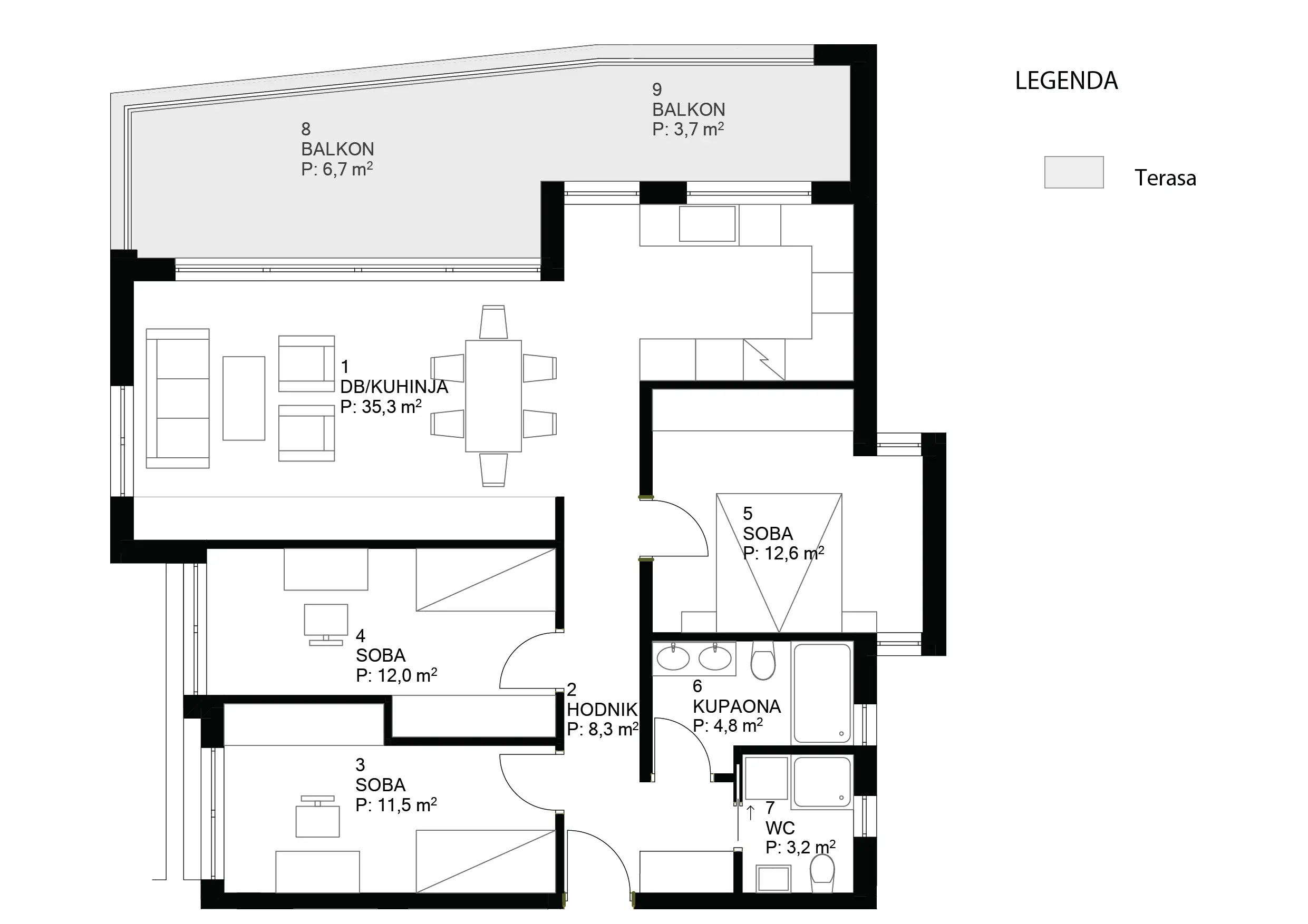 Vanjska ALU-PVC stolarija opremljena je vrhunskim okovom, dok zaštitu od sunca osiguravaju aluminijske rolete i vanjski brisoleji, omogućujući optimalnu kontrolu svjetlosti i topline u prostoru.